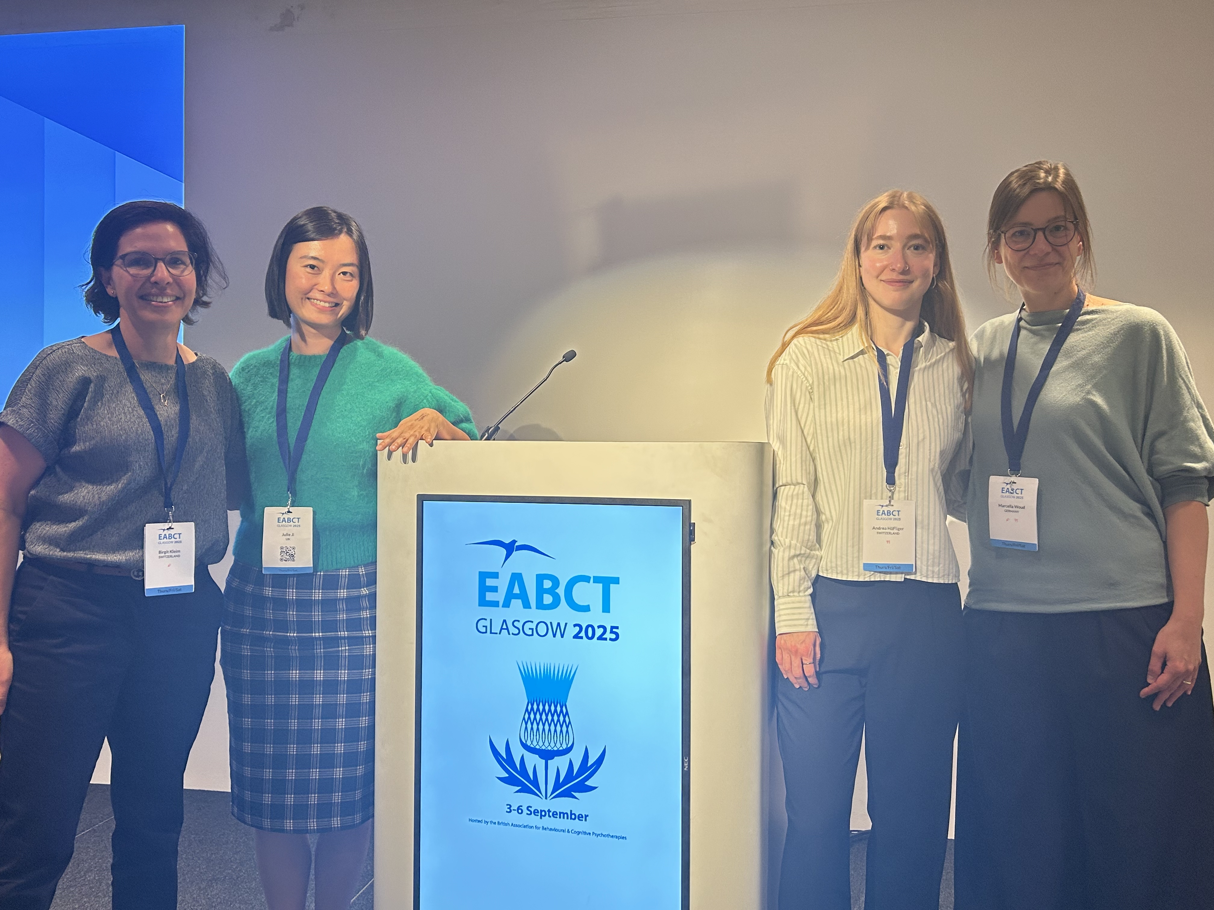 At the 2025 EABCT conference in Glasgow, our team organized and presented a symposium chaired by Prof. Birgit Kleim. Andrea Häfliger presented her new findings from an experimental study on self-efficacy autobiographical memory training targeting precursors of suicidality. The symposium highlighted cutting-edge experimental research, featuring also Prof. Would on cognitive bias modification and Dr. Ji on imagery in individuals with non-suicidal self-injury.